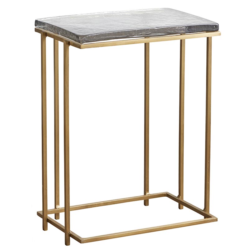 A modern gold metal frame meets beautiful glass table for an elevated look. Can by styled with a lamp, books, or other home décor items.